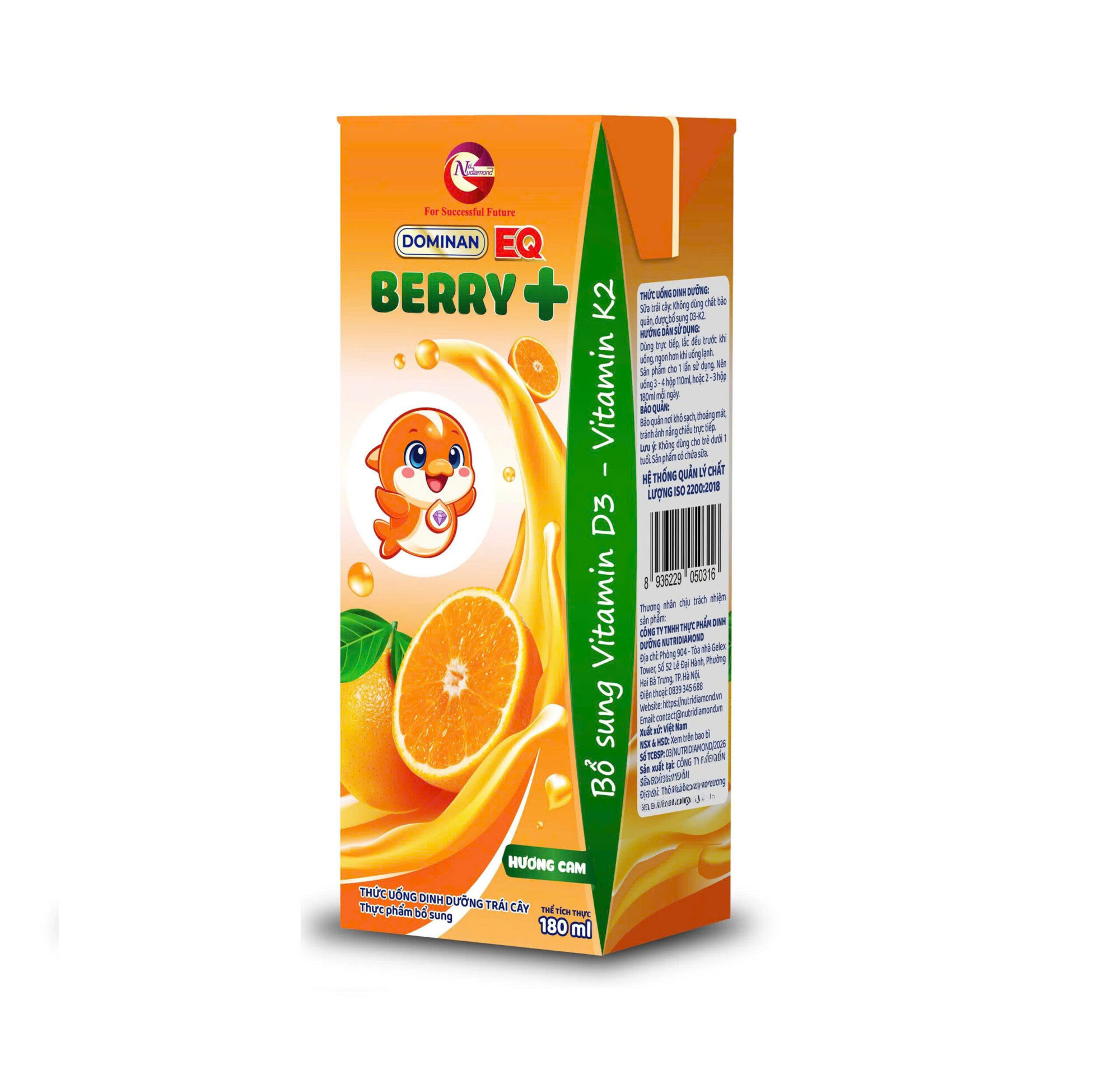 - Thức uống dinh dưỡng trái cây: DOMINAN EQ BERRY+ Hương cam 180ml, là thực phẩm bổ sung Vitamin K2 – Vitamin D3 – Sữa được kết hợp với nước ép trái cây tự nhiên, hương cam, thơm ngon, bổ dưỡng cho bé yêu thích.