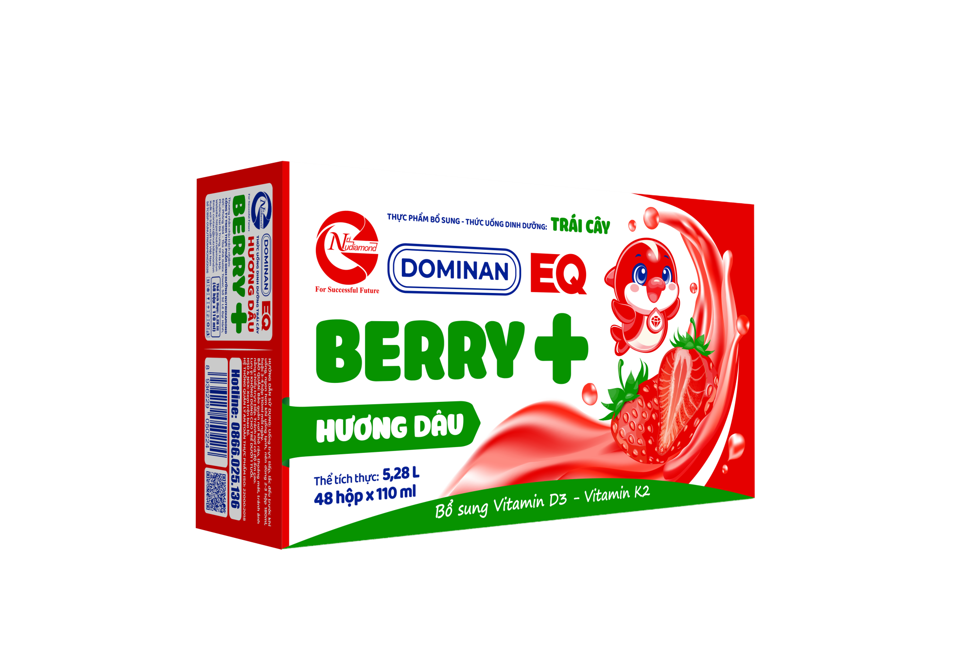 Thức uống dinh dưỡng trái cây: DOMINAN EQ BERRY+ Hương dâu 110ml, là thực phẩm bổ sung Vitamin K2 – Vitamin D3 – Sữa được kết hợp với nước ép trái cây tự nhiên, hương dâu, thơm ngon, bổ dưỡng cho bé yêu thích.